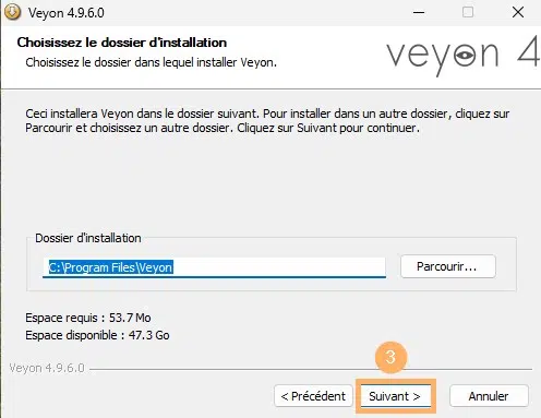 Choisissez l’emplacement du dossier dans lequel vous souhaitez installer Veyon. Vous pouvez conserver le chemin par défaut proposé (C:\Program Files\Veyon) ou sélectionner un autre répertoire si nécessaire.