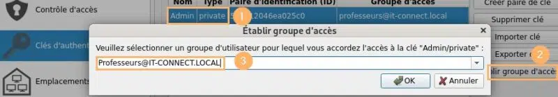 Allez dans l’onglet « Clés d’authentification », sélectionnez la clé privée, puis cliquez sur « Établir un groupe d’accès ». Ajoutez ensuite un groupe du domaine autorisé à utiliser cette clé.