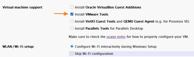 Ensuite, vous devez configurer les différentes options selon vos besoins. Ce qui est important dans le contexte de VMware Workstation, c'est de cocher l'option "Install VMware Tools" dans la section "Virtual machine support". Ceci permettra d'avoir une VM prête à l'emploi, avec les VMware Tools installées sur Windows.
