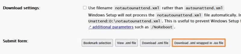 Ensuite, quand tout est prêt, descendez en bas de la page. Téléchargez le fichier de réponse sous la forme d'une image ISO via le bouton "Download .xml wrapped in .iso file". Ceci va permettre d'associer le fichier de réponse à la VM par l'intermédiaire d'un lecteur DVD virtuel.