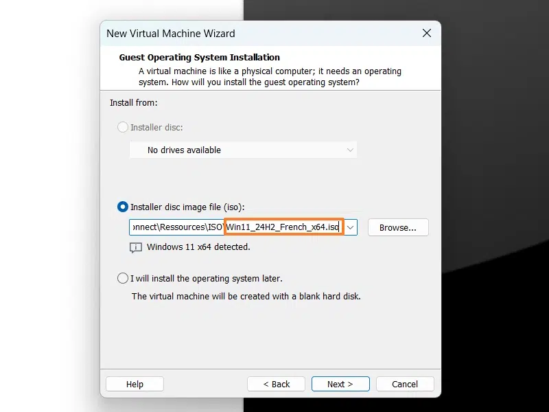 À partir de VMware Workstation Pro, créez une nouvelle VM en suivant l'assistant habituel... Nous sélectionnons bien l'image ISO de Windows 11. Poursuivez...