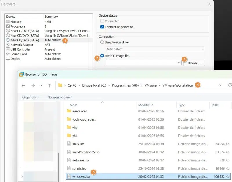 - Créer une nouvelle machine avec trois lecteurs DVD virtuels pour associer 3 ISO : Windows 11, le fichier de réponse et les VMware Tools