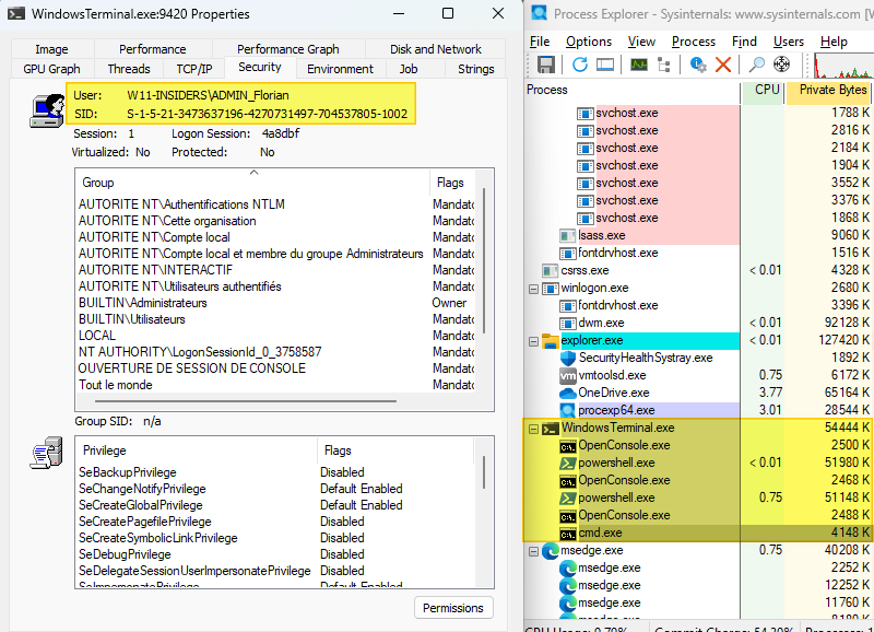 Une analyse des processus avec Process Explorer montre bien que le processus Windows Terminal a été lancé par le compte ADMIN_Florian.