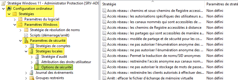 - Configuration ordinateur > Stratégies > Paramètres Windows > Paramètres de sécurité > Stratégies locales > Options de sécurité