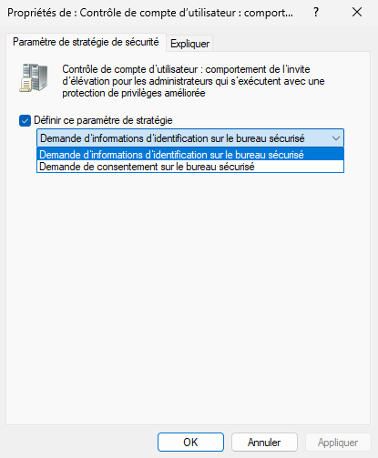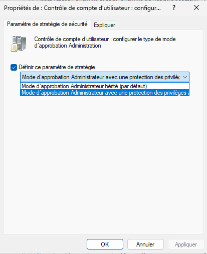 3. Ici, vous devez configurer un paramètre de stratégie intitulé : "Contrôle de compte d'utilisateur : Configurer le type de mode d'approbation Administration", et choisissez la valeur nommée "Mode d'approbation Administrateur avec une protection des privilèges améliorée". Ce n'est pas très explicite avec la version française, mais cela correspond à Administrator Protection.