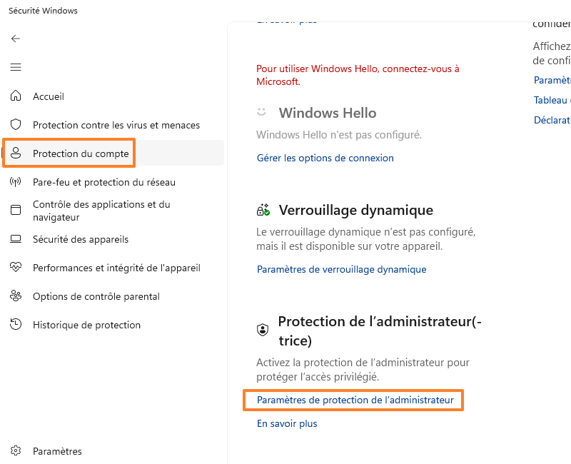 4. Localisez l'option Protection de l'administrateur(-trice) et cliquez sur le lien Paramètres de protection de l'administrateur