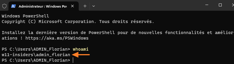 Il est intéressant de noter que l'élévation de privilèges n'est pas effectuée avec mon compte utilisateur, mais avec un compte spécial nommé : ADMIN_Florian. La commande whoami permet de mettre en évidence cette particularité. Ainsi, il y a une séparation entre ce compte et le compte principal.