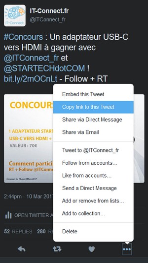 Dans le cas de TWrench, il faut indiquer l'URL du tweet du jeu concours, vous pouvez l'obtenir directement depuis Twitter ou Tweetdeck. Il suffit de cliquer sur le tweet, et ensuite sur l'icône avec les points en bas à droite sur Tweetdeck ou la flèche en haut à droite sur Twitter. Vous avez ensuite accès à un bouton pour copier le lien du tweet.