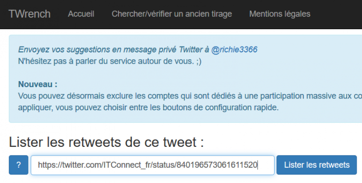 Pour réaliser un tirage au sort et prouver qu'il est réalisé selon les règles de l'art, j'ai utilisé l'outil TWrench pour le dernier jeu concours que nous avons utilisés. Ce service gratuit réalisé le tirage au sort à votre place en s'appuyant sur des règles de participation que vous configurez.