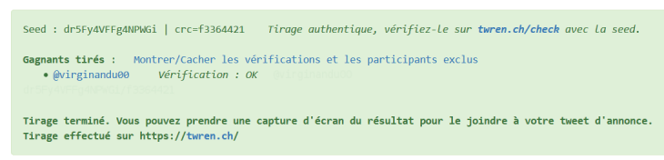 Dès lors que le tirage définitif est effectué les résultats sont publiés sur le site de TWrench. N'importe qui peut alors vérifier l'authenticité du tirage au sort, et bien entendu le ou les gagnants sont affichés à l'écran.