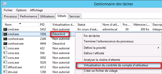 Ensuite, pour connaitre le niveau de privilège d’un processus, il vous faut lancer le gestionnaire des taches, puis sous l’onglet “Processus” (W7/2008) ou “Détails” (W8/2012*), ajouter la colonne “Virtualisation du contrôle de compte d’utilisateur” (* Pas de menu, nécessite affichage détaillé puis un clic droit sur les entêtes de colonnes, et “sélectionner des colonnes”).