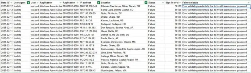 Les administrateurs de tenant Microsoft 365 sont invités à vérifier les journaux d'Entra ID. En effet, SecurityScorecard précise que ces journaux peuvent révéler des signes d'attaques par pulvérisation de mots de passe, notamment une hausse des connexions non interactives et des échecs de connexion depuis plusieurs adresses IP. De plus, la présence de la chaine user-agent "fasthttp" dans les journaux est un indicateur à prendre en considération.