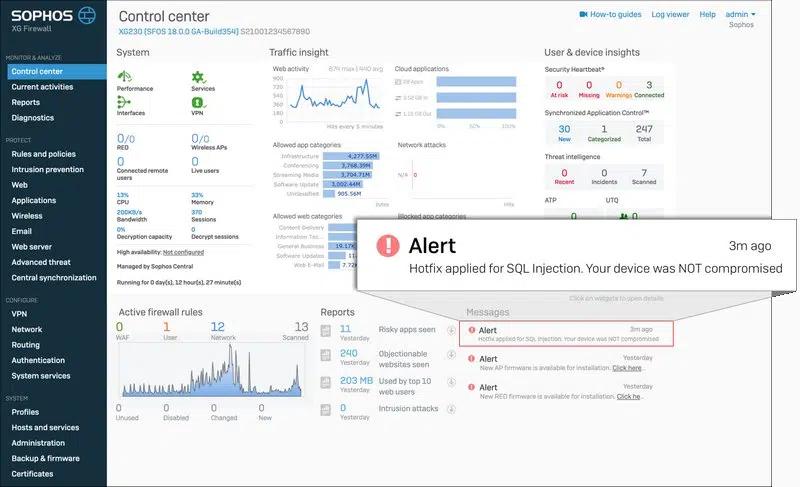 La faille de sécurité zero-day en question est associée à la référence CVE-2020-12271 et a un score CVSS de 9,8 sur 10. Il s'agit d'une vulnérabilité critique correspondant à une injection SQL. En l'exploitant, un pirate peut exécuter du code à distance sur l'appareil pris pour cible. Plusieurs versions de SFOS, le système utilisé par les firewalls Sophos XG, étaient vulnérables à cette faille de sécurité : 17.0, 17.1, 17.5, et 18.0. Un correctif est déjà disponible depuis 2020.