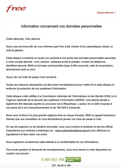 Dans ce même courrier envoyé par e-mail aux abonnés de Free, il est précisé que les pirates sont parvenus à accéder aux données personnelles d'une partie des clients. Parmi les données personnelles concernées, nous retrouvons : nom, prénom, adresses e-mail et postales, numéro de téléphone, identifiant abonné, IBAN et données contractuelles (type d'offre souscrite, date de souscription, abonnement actif ou non). Free précise aussi que cet incident de sécurité n'a aucun impact sur les mots de passe.