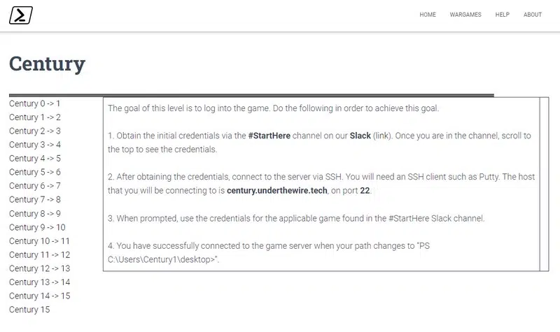Pour accéder à un jeu, comme à celui nommé Century, par exemple, vous devez accéder au Slack d'Under the Wire pour récupérer le nom d'utilisateur et le mot de passe d'accès. Ceci permet d'accéder à la quête 0 pour commencer à jouer !