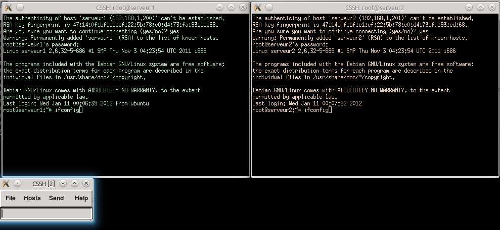 Il suffit de se positionner sur le champ de saisie de CSSH qui apparaît sous les fenêtres des serveurs. Dans cet exemple, la commande ifconfig est passée sur les serveurs.