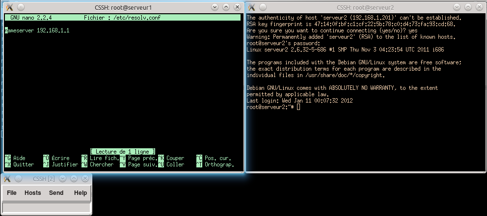 Cluster SSH est une application disponible sous Linux permettant d'administrer via SSH plusieurs hôtes en même temps, c'est à dire que lorsque vous saisissez une commande celle-ci s'exécute sur l'ensemble des hôtes du cluster, mais en sélectionnant une fenêtre précise parmi celle ouverte vous pouvez exécuter une commande dans un seul shell.