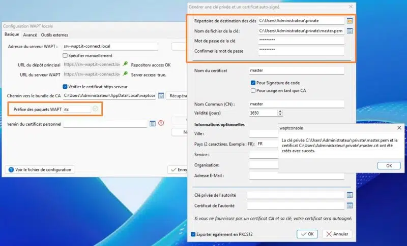 En tant qu'administrateur de la solution, vous devez ensuite créer une nouvelle clé privée (associée à un mot de passe) et un certificat auto-signé (sauf si vous fournissez des informations sur votre CA). C'est un point très important en lien direct avec la sécurité de WAPT : la clé privée est utilisée pour signer les paquets WAPT.