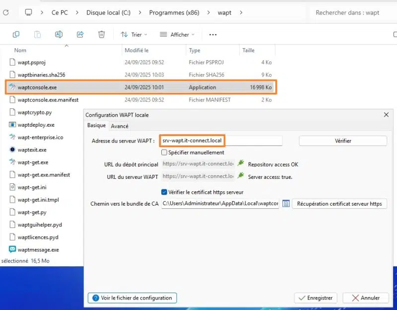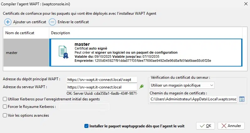 En effet, la signature des paquets avec votre clé privée garantit leur intégrité et leur authenticité. Lorsqu’un poste client télécharge un paquet depuis le dépôt WAPT, il vérifie automatiquement la signature avec le certificat public correspondant. Si la signature ne correspond pas, le paquet est rejeté, ce qui empêche l’exécution de logiciels non autorisés ou altérés. La clé privée, représentée ici par le fichier master.pem doit impérativement être sauvegardée.
