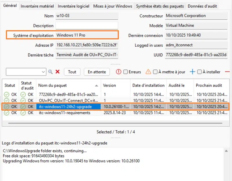 Pour lancer la mise à niveau, il suffit d'associer le paquet à une machine. Ici, je vais modifier la machine W10-03 pour lui associer le paquet. Pour rappel, il s'agit de la seule machine compatible avec Windows 11 au sein de mon inventaire.