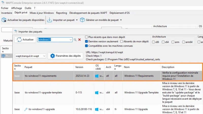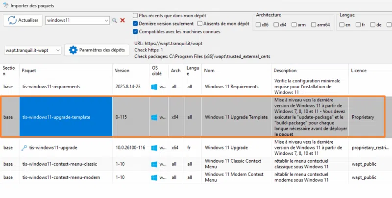 Sur le même principe que précédemment, ajoutez le paquet suivant à votre dépôt privé : tis-windows11-upgrade-template. Ce paquet n'est pas immédiatement prêt à l'emploi, car il doit être personnalisé comme mentionné précédemment.