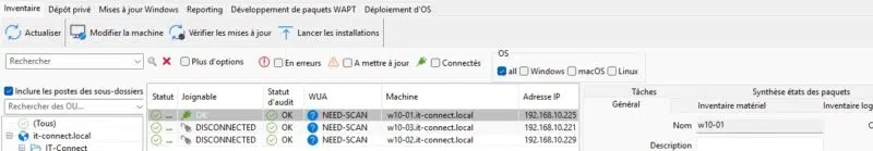 L'agent WAPT est récupérable directement par l'intermédiaire de l'interface web du serveur : http://srv-wapt.it-connect.local. C'est un exécutable que vous pouvez installer en quelques clics, et ensuite les appareils remontent tour à tour dans l'inventaire WAPT. Au sein de la console WAPT, l'inventaire liste tous les appareils où l'agent WAPT est installé, avec leur statut, leur nom et la dernière adresse IP connue.