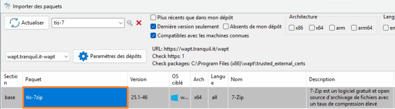 Avant de commencer, assurez-vous de disposer de l'application 7-Zip sur le serveur où la console WAPT est installée. Vous pouvez manuellement l'installer ou par l'intermédiaire du paquet tis-7zip. Sans cela, l'image ISO de Windows 11 ne pourra pas être importée.