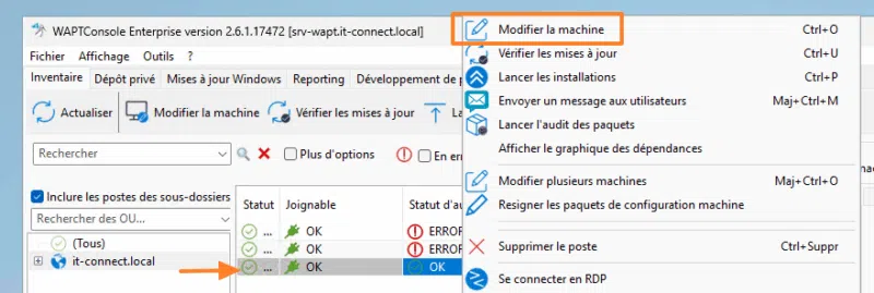 Comme le montre l'image ci-dessous, le paquet est associé à l'unité d'organisation. Ainsi, toutes les machines situées à cet emplacement vont l'installer. Pour accéder à l'écran de sélection du paquet, effectuez un clic droit sur l'OU puis sélectionnez l'option "Créer ou éditer le paquet de l'Unité Organisationnelle". Les résultats de l'audit seront remontés progressivement dans la console.