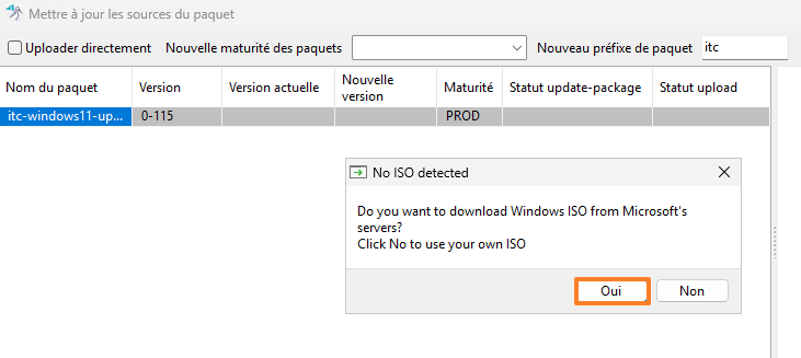 L'image ISO n'étant pas présente, vous avez deux options : cliquez sur "Oui" pour télécharger l'image ISO depuis le site de Microsoft ou cliquez sur "Non" pour utiliser un ISO personnalisé. Ici, nous prenons l'image officielle. Cette image ISO sera poussée sur les postes via le réseau pour réaliser la mise à niveau.