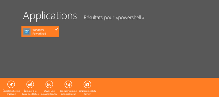 Par exemple sous Windows 8, vous pouvez placer votre souris dans le coin supérieur droit de votre écran pour faire apparaître la Charm Bar, puis cliquez sur « Rechercher » et saisissez « powershell ». Sur la gauche, apparaîtra la tuile de la console. Faites un clic droit dessus puis dans la partie basse cliquez sur « Exécuter comme administrateur ».