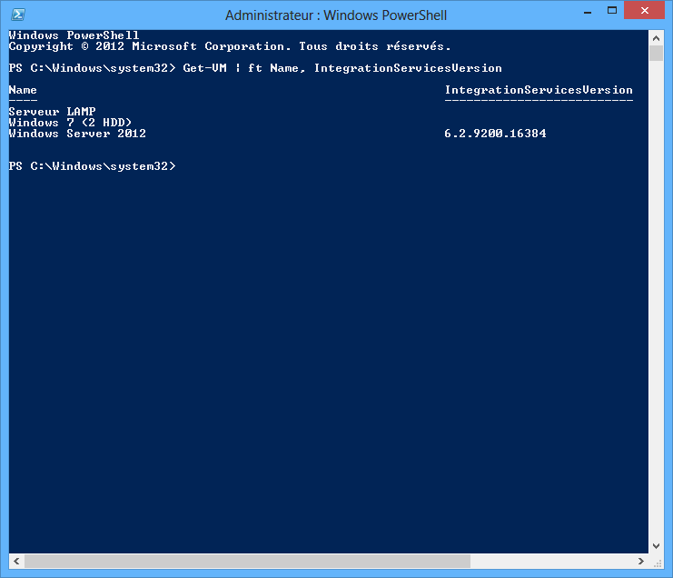 Le command-let « Get-VM » permet de lister les ordinateurs virtuels et ce qui suit est un filtre qui permet d’afficher uniquement les colonnes « Name » pour le nom et « IntegrationServicesVersion » pour obtenir la version des services d’intégrations pour chaque VM. Ce qui donnera :