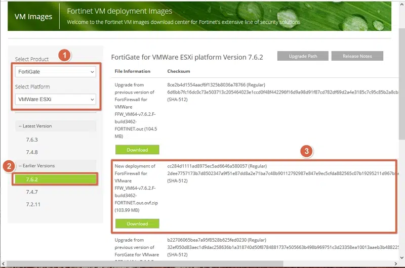 Une fois le compte créé, rendez-vous à l'adresse suivante : support.fortinet.com/Download/VMImages.aspx. Choisissez FortiGate comme produit et VMware ESXi comme plate-forme. Sélectionnez la version de l'image à du pare-feu à émuler (fichier zippé) et cliquez sur Download pour télécharger et l'enregistrer.