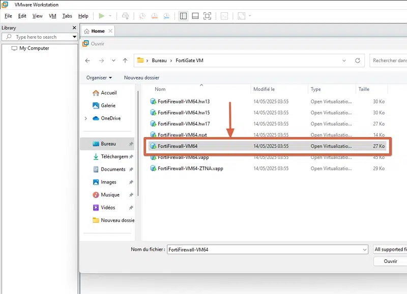 1. D'abord, on va décompresser l'image de FortiGate-VM précédemment téléchargée, dans un dossier. On peut directement aller double-cliquer sur le fichier FortiGate-VM64.ovf pour lancer l'importation de la VM dans VMware Workstation Pro ou alors aller l'ajouter depuis l'hyperviseur.