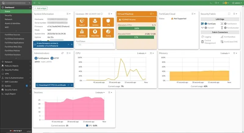 Si vous vous reconnectez à la machine virtuelle, vous aurez la possibilité d'effectuer des configurations optionnelles. Celles-ci incluent la personnalisation du tableau de bord, le choix du mode de mise à jour de FortiOS, ou encore la migration via FortiConverter. Une fois cette étape franchie, l'administration de votre pare-feu peut débuter.