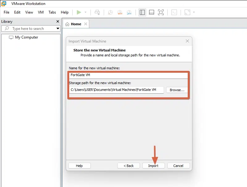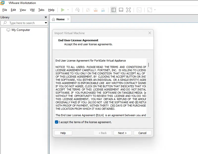 2. Il faut ensuite accepter les conditions de licence d'utilisateur final, puis donner un nom quelconque à la VM (ici FortiGate VM) et cliquer sur Import pour finaliser son importation dans VMware Workstation Pro.