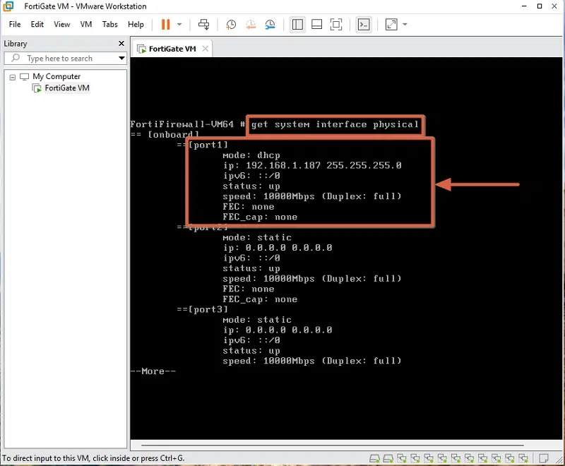 Comme la VM est sur un réseau physique avec un serveur DHCP, le port relié au LAN physique devrait être automatiquement configuré avec une adresse IP. Pour connaitre l'adresse attribuée à notre port, il suffit de rentrer la commande get system interface physical dans le terminal intégré à la VM.
