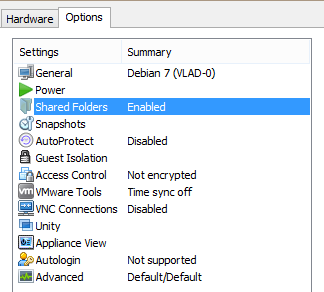 Il faut commencer par se rendre dans la configuration de notre machine virtuelle. Dans la fenêtre des paramètres on ira dans "Options" puis on sélectionnera "Shared Folder" :