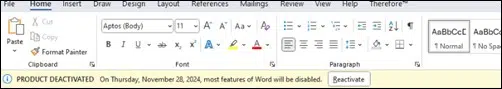 Par conséquent, une bannière s'affiche dans les applications telles que Word et Excel, pour indiquer à l'utilisateur que son produit est désactivé et que les applications seront prochainement désactivées.