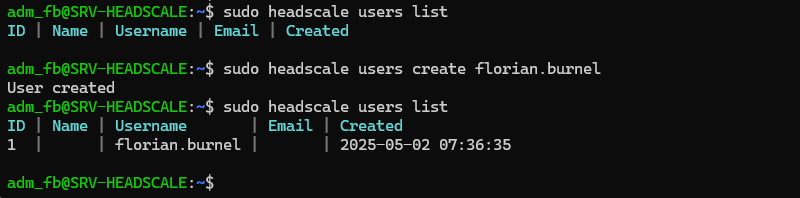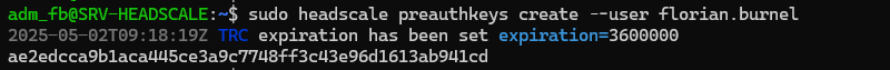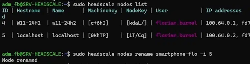 sudo headscale nodes register --user florian.burnel -key <Clé>