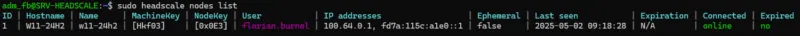 Sur le serveur Headscale, vous pouvez lister les clients pour vérifier la présence d'un nouvel appareil :