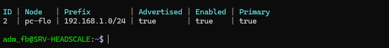 L'information sera remontée auprès du serveur Headscale. Vous pouvez vous en assurer en listant les routes :