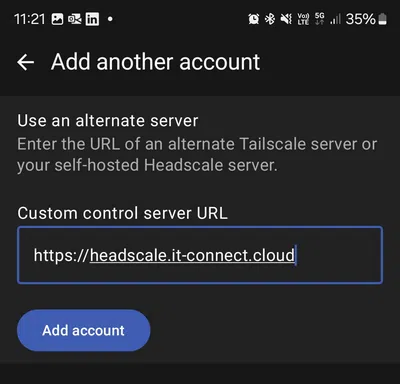 Vous devez renseigner l'adresse URL de votre serveur Headscale. Ici, je précise donc https://headscale.it-connect.cloud.