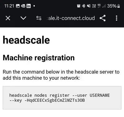 Sur le smartphone, la commande spécifiée ci-dessous s'affiche et elle doit être exécutée sur le serveur Headscale pour effectuer l'inscription de ce nouveau client. Il s'agit d'une tentative d'inscription initiée depuis le smartphone et qui doit être approuvée.