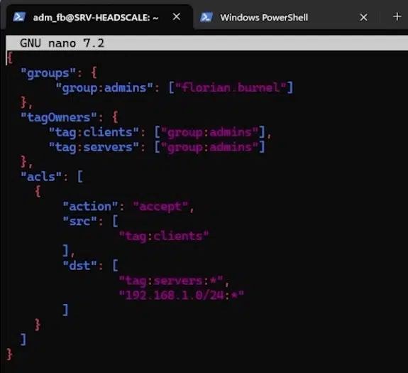 L'exemple ci-dessous permet de créer le groupe admins dont l'utilisateur florian.burnel sera membre. Ce groupe sera propriétaire de 2 tags : clients qui sera affecté aux appareils considérés comme des clients et serveurs pour les appareils considérés comme des cibles à administrer. L'idée étant d'autoriser les clients à accéder aux serveurs, sans qu'un client puisse se connecter à un autre client. Les clients pourront aussi accéder au réseau 192.168.1.0/24. Ici, nous ne filtrons pas sur les ports (*), mais il est possible d'appliquer des restrictions différentes selon des groupes.