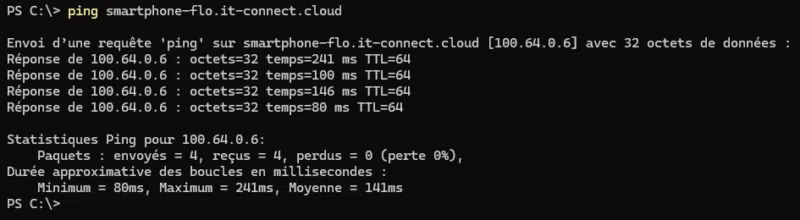 Depuis le nœud sous Windows, il est tout à fait possible d'effectuer un ping du smartphone via son nouveau nom. Bien entendu, les deux appareils doivent être connectés au réseau Headscale pour que cela fonctionne.