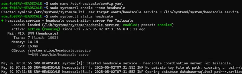 Enregistrez la configuration puis fermez le fichier. Activez le démarrage automatique et lancez Headscale :