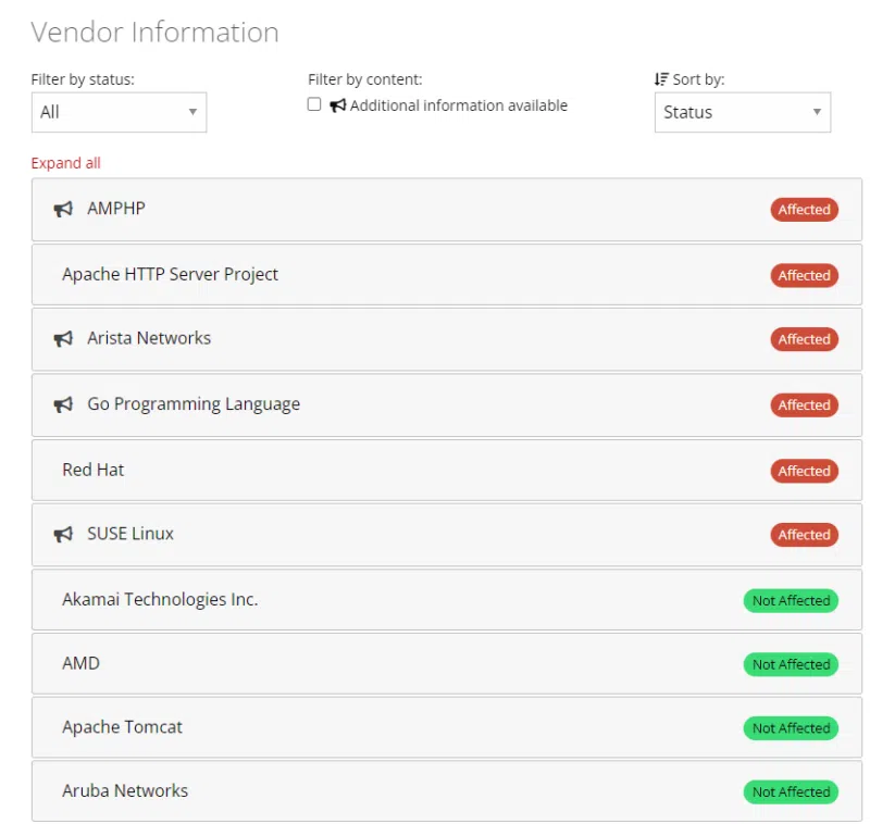 À la fin de l'article du CERT/CC, il y a un tableau récapitulatif, et nous pouvons voir que le statut est actuellement inconnu pour plusieurs dizaines d'implémentations. Voici un extrait :