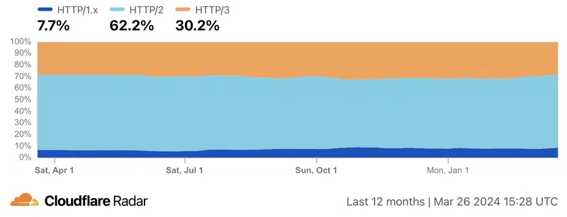 Par ailleurs, il est important de préciser que le protocole HTTP/2 est encore largement utilisé. "Selon Cloudflare Radar, le trafic HTTP/2 représente environ 60 % de l'ensemble du trafic HTTP humain (données excluant les robots)", précise Barket Nowotarski, avec un graphe à l'appui.