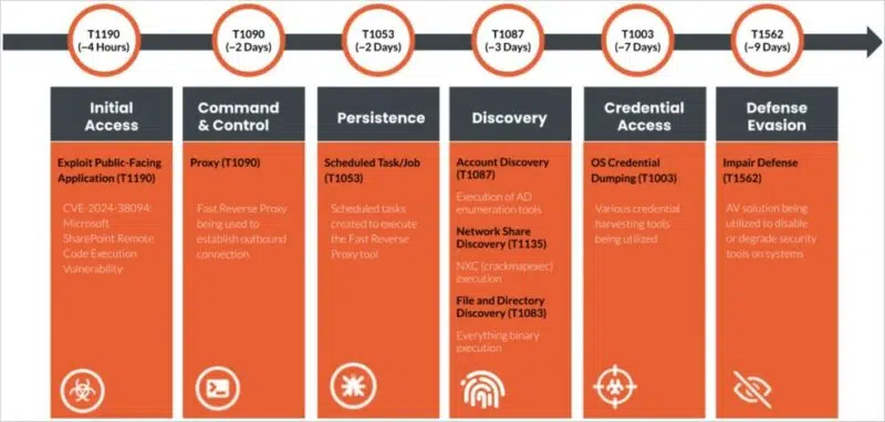 Le schéma ci-dessous, présent dans le rapport de Rapid7, représente le déroulement de l'attaque, étape par étape. Il met clairement en évidence l'exploitation de la CVE dans SharePoint comme vecteur d'accès initial.