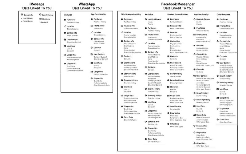 Une synthèse publiée sur le site Forbes montre à quel point la messagerie de Facebook, Messenger, est nettement plus curieuse et intrusive que WhatsApp qui fait tant débat ces derniers jours (désolé pour la qualité de l'image). Tout ça pour dire que si vous fuyez WhatsApp alors fuyez Facebook dans son ensemble, car Messenger est le pire de tous !